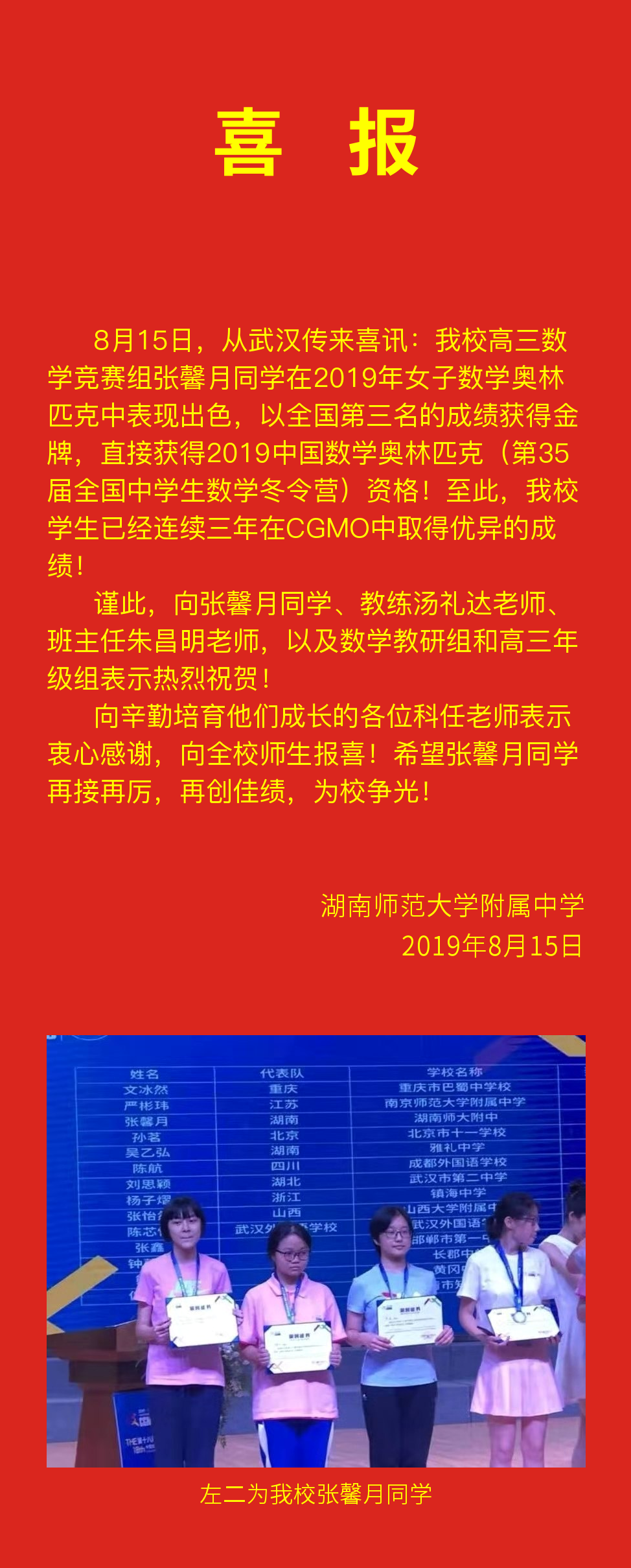 新闻中心 附中新闻 通知公告 最新动态 教育视点 集团学校新闻联播 媒体附中 工作安排 微信附中 喜报:张馨月同学荣获2019年女子数学奥林匹克竞赛金牌 发布:管理员 来源:未知 日期:2019-08-15 人气:分享到: 上一篇:喜报:向妤菡、潘周捷两位同学入选生物奥赛国家集训队 下一篇:谢永红应邀参加清华大学2019年开学典礼,陈俊豪给校长献花 通知公告 更多 关于征集湖南师大附中“十五五” 湖南师大附中2026年教师招聘(第 湖南师大附中2025年教育教学成果 湖南师范大学附属中学2025年零星 关于举办第40届校园文化艺术节的 湖南师范大学附属中学2026年教师 最新动态 更多