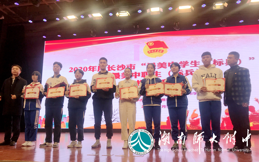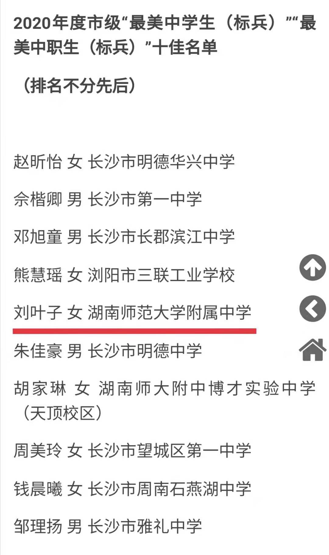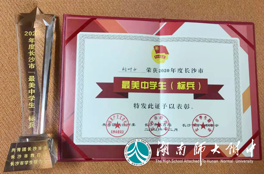 新闻中心 附中新闻 通知公告 最新动态 教育视点 集团学校新闻联播 媒体附中 工作安排 微信附中 刘叶子同学荣获2020年度长沙市“最美中学生(标兵)”光荣称号 发布:管理员 来源:团委 日期:2020-12-08 人气:分享到: 2020年9月下旬,为引导中学中职学生按照习近平总书记提出的“爱国、励志、求真、力行”的要求健康成长,共青团长沙市委、长沙市教育局、长沙市学生联合会在全市寻访一批最美中学生。 第二十七届全国学联代表、我校学生会主席刘叶子经过材料申报、团市委审批,成功入围长沙市“最美中学生”名单;12月5日在雅礼中学礼堂的现场风采展示中,刘叶子凭借紧跟时代、个性鲜明的主题,自信大方、扣人心弦的谈吐,在20位候选人中脱颖而出,得到评委老师们的一致好评,荣获2020年度市级“最美中学生(标兵)”的荣誉称号。 上一篇:学校召开安全大检查工作部署会议 下一篇:第35届校园艺术节| 高二年级舞台剧表演比赛及七年级合奏表演 通知公告 更多 湖南师范大学附属中学2025年第二 湖南师范大学附属中学2025年第二 湖南师范大学附属中学2025年第二 湘人社办函〔2025〕46号计算机应用 中国教育发展战略学会教育评价专 湖南师范大学附属中学2025年招聘 最新动态 更多