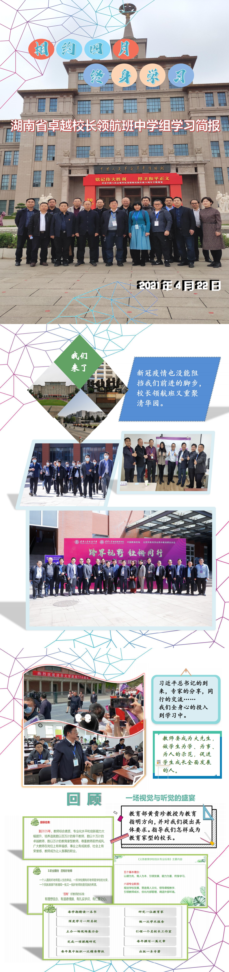 新闻中心 附中新闻 通知公告 最新动态 教育视点 集团学校新闻联播 媒体附中 工作安排 微信附中 黄月初参加湖南省中小学卓越校长领航研修项目清华大学班第二次集中研修 发布:管理员 来源:党委办公室 日期:2021-04-30 人气:分享到: 4月17至23日,国培计划(2020 )一湖南省中小学卓越校长领航研修项目在清华大学开展第二次集中研修。我校党委书记黄月初参加研修并作精彩分享。 此次研修在抗击新冠肺炎疫情取得阶段性胜利的背景下开展,又恰逢清华大学110周年校庆、习总书记考察清华大学,学员们备受鼓舞,士气满满。在班长黄月初的组织下,学员们充分交流办学治校经验,致力践行“学术治校”,通过多形式的研修实践,突破校长成长瓶颈,提升卓越校长领导力,打造示范引领和辐射带动作用强的名校长工作室。 4月22日,学员们来到中国人民革命军事博物馆参观“铭记伟大胜利 捍卫和平正义——纪念中国人民志愿军抗美援朝出国作战70周年主题展览,通过照片、实物,缅怀英烈,听志愿军官兵出国作战中的英雄故事,大家追忆浴血奋战的岁月,重温同仇敌忾、万众一心的爱国情怀。大家纷纷表示,将大力弘扬伟大的抗美援朝精神,为决胜全面建成小康社会、夺取新时代中国特色社会主义伟大胜利、实现中华民族伟大复兴的中国梦不懈奋斗。 2020,校长研修班向前推进,硕果累累;2021,校长研修班持续发力,步履不停。湖南省中小学卓越校长领航研修项目是经省厅批复立项的国培计划高端研修项目。经过专家组评审,遴选了30位湖南省中小学校长,计划通过两年分期次,多形式的研修实践,培育省级卓越校长团队,打造示范引领和辐射带动作用强的名校长工作室,形成卓越校长领导力有效提升的案例模式和优质资源。 上一篇:校团委再次获评“全国五四红旗团委” 下一篇:黄月初被聘为第八届省政府督学 通知公告 更多 关于开展“科研优秀奖”评选活动 湖南师大附中2025-2026学年度第一学 湖南师范大学附属中学2025级新生 湖南师范大学附属中学大泽湖校区 2025年湖南省基础教育教学成果奖 湖南省教育厅关于开展2025年湖南 最新动态 更多