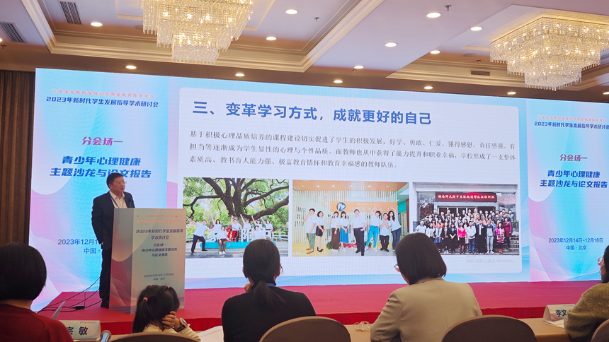 12月14日-16日,2023年新时代学生发展指导学术研讨会在北京举办。研讨会是中国教育学会学生发展指导分会成立后的第一次重要会议。我校党委书记黄月初参会并作《基于高中生积极心理品质培养的校本研究》学术报告。