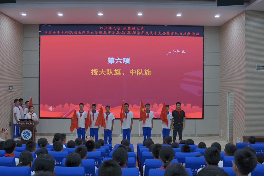 10月10日、,“以少年之名 承英雄之志”中国少年先锋队湖南师范大学附属中学2025-2026学年度代表大会暨建队日庆祝活动在惟一大讲堂举行。党委委员、纪检书记李春莲,党委委员、副校长廖强出席此次活动。相关部门负责人参加活动。仪式由大队长薛可依主持。
