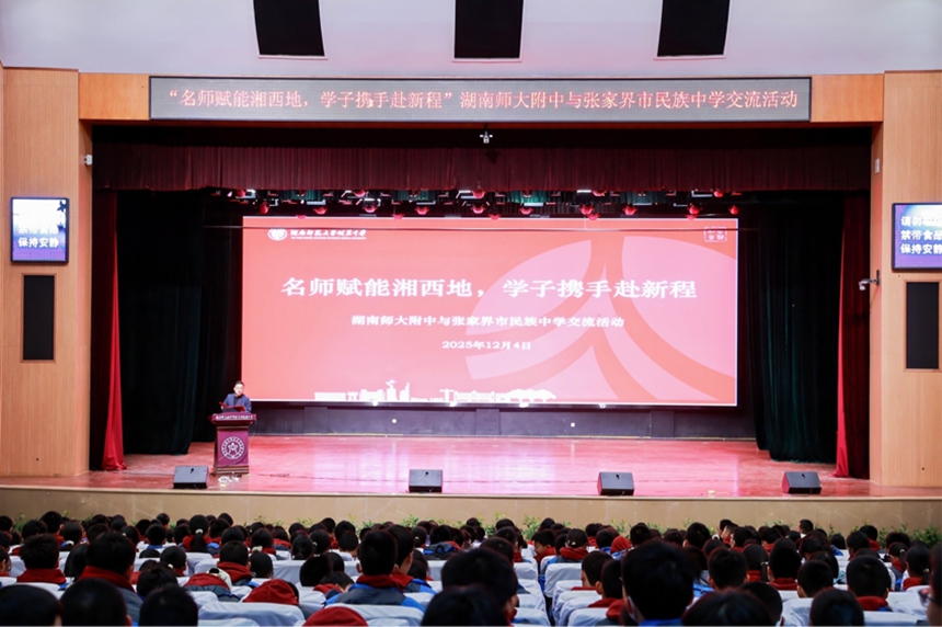 活动中,湖南师大附中语文、英语、生物、地理等学科教师走进张家界市民族中学课堂,开展教学共研与示范授课,围绕课程设计、学习方法等内容进行深入交流,助力提升民族地区中学的教学教研水平。两校学生还以“结对伙伴”形式组建学习共同体,开展学科经验分享与协作能力培训,搭建起长期互助、共同成长的友谊桥梁。