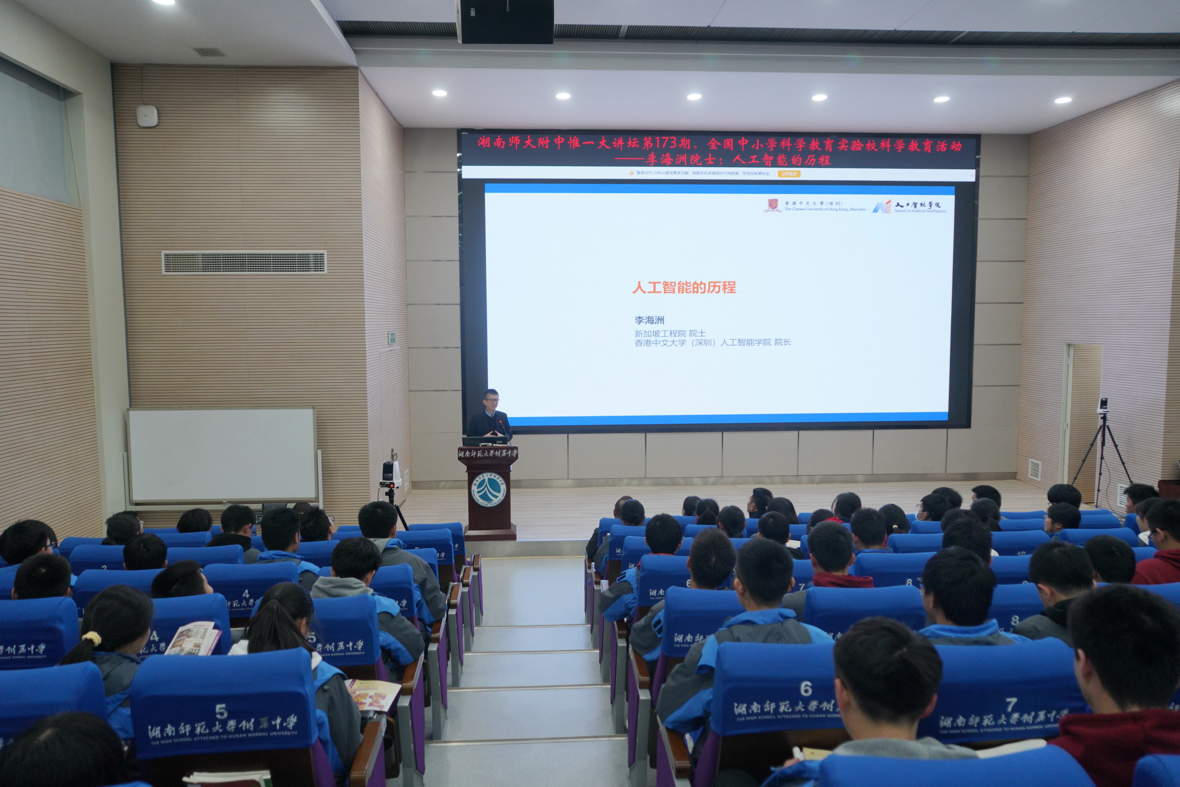 同日,李海洲院士在桃子湖校区主会场以 “人工智能的历程” 为题开讲,两校区通过 “主会场 + 分会场” 及线上直播同步参与。他以自身经历结合语音助手等场景引入,梳理 AI 从早期机器翻译到大语言模型的发展脉络,对比语言模型与人脑结构,用 “你聪明,AI 就聪明” 点出清晰提问的核心要义。分享苹果中文听写套件等科研案例时,他勉励学子保持技术好奇心,在实践中感悟科技力量。