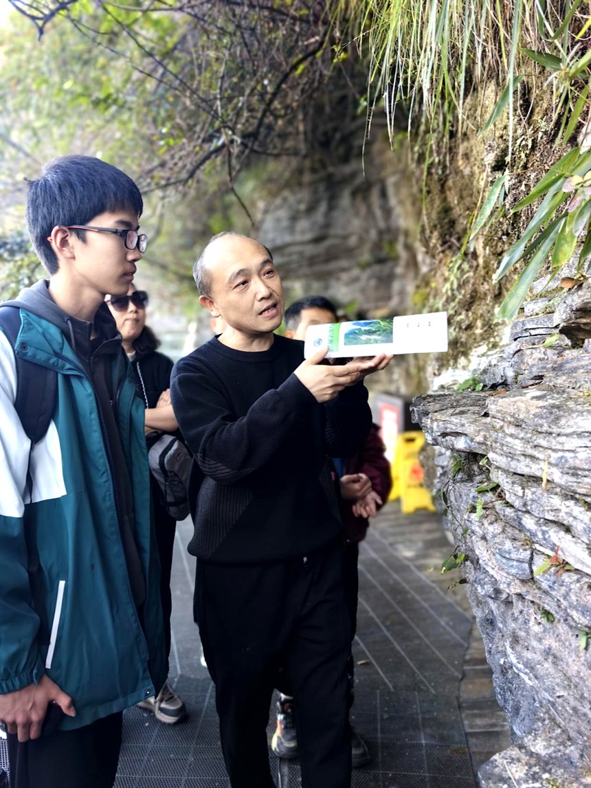 11月30日上午,工作室全体成员实地考察古丈红石林,面对峭立的石柱和鲜艳的赭红岩壁,结合地质图分析其奥陶纪海底沉积与后期风化剥蚀的成因。在向超老师指导下,大家现场辨识岩石层理、测量节理走向,并思考这片特殊地貌所蕴含的古气候与构造运动信息,将抽象的地质年代与演化理论转化为生动的野外认知。