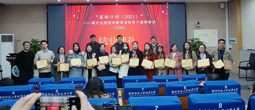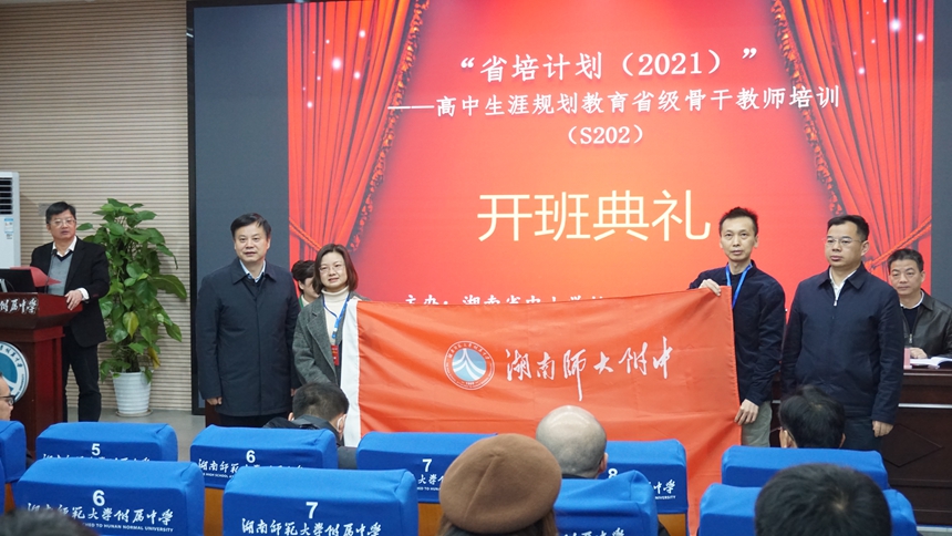 易晓辉、谢永红为培训班授旗,学员代表长沙县一中吴耀明主任和长沙市周南梅溪湖中学黄静老师从领导手中接过班旗,培训班宣告成立。学员代表温宇老师作了发言。她结合自身的工作经验,感慨生涯规划教育对于学生发展的重要性。