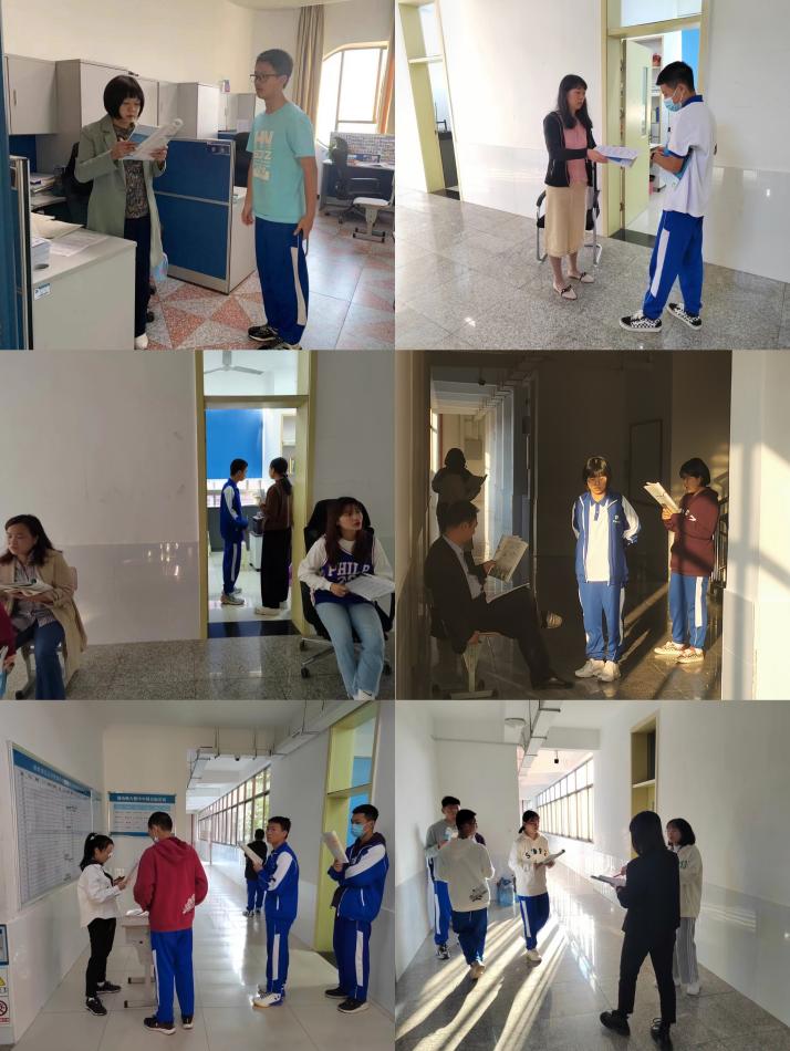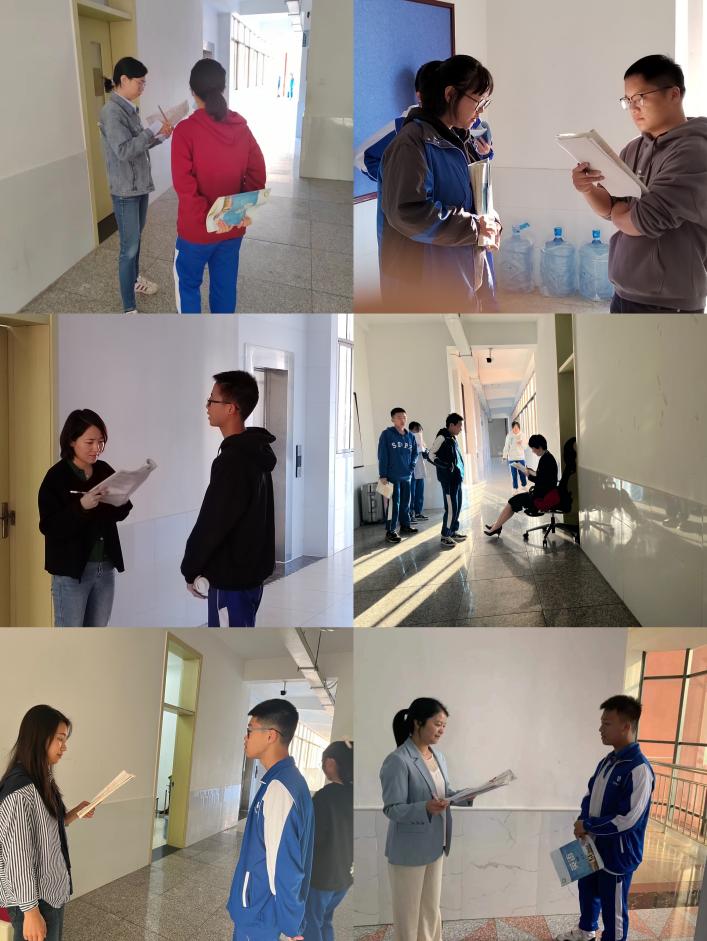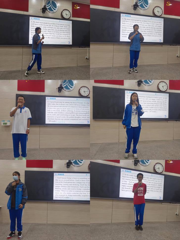 (早读抽背活动)10月12日早自习铃声响起后,英语背诵大赛正式拉开帷幕。班级背诵内容均为课文选段,旨在引导学生重视课文内容,并督促学生巩固课文知识。早自习每隔5-10分钟广播将随机抽取学号,高一的每一位学生都有被抽选背诵的可能,随机的方式极大地调动了学生的英语学习积极性。大赛期间,高一英语组的全体老师们两人为一组,在各楼层中庭为抽到学号的学生背诵打分。在此期间,各班班主任老师进班陪伴学生早读,管理、维持班级纪律。“本周开始英语早读筹备,效果很好,教室里面书声琅琅,”课程与教学处黄宇鸿主任在学校年级主任群肯定了高一的英语早读氛围,认可了大赛对学生落实基础的作用,同时指出背诵大赛“值得其他年级推广,值得借鉴。”此次大赛极大地调动了高一学生的英语学习兴趣,营造了良好的英语学习氛围,全年级共计143人荣获“背诵优秀个人”称号。