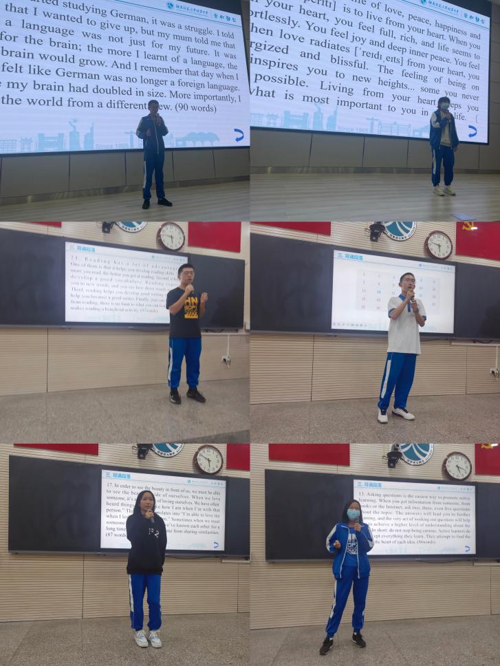 (英语背诵小能手比赛)10月20日,我校高一英语组组织开展了英语背诵小能手比赛。比赛为个人参赛形式,旨在提升学生的理解性背诵能力,并鼓励学生站上舞台,培养学生的英语口语表达能力。赛前,1-26班各选出两名背诵小能手,英语老师对参赛选手进行赛前指导。指导内容包括:文本分析和理解性背诵的方法,以及公众演讲的方式方法。背诵小能手比赛分为两个场地,分别在学校会议厅和惟一楼东头多功能教室举行。背诵比赛的流程紧凑,每名选手抽到背诵段落后有5分钟的时间准备,并要求在90秒内完成背诵,对学生的记忆能力、英语能力和心态都是一种挑战。共有50名选手参赛,100名学生现场观看了比赛。