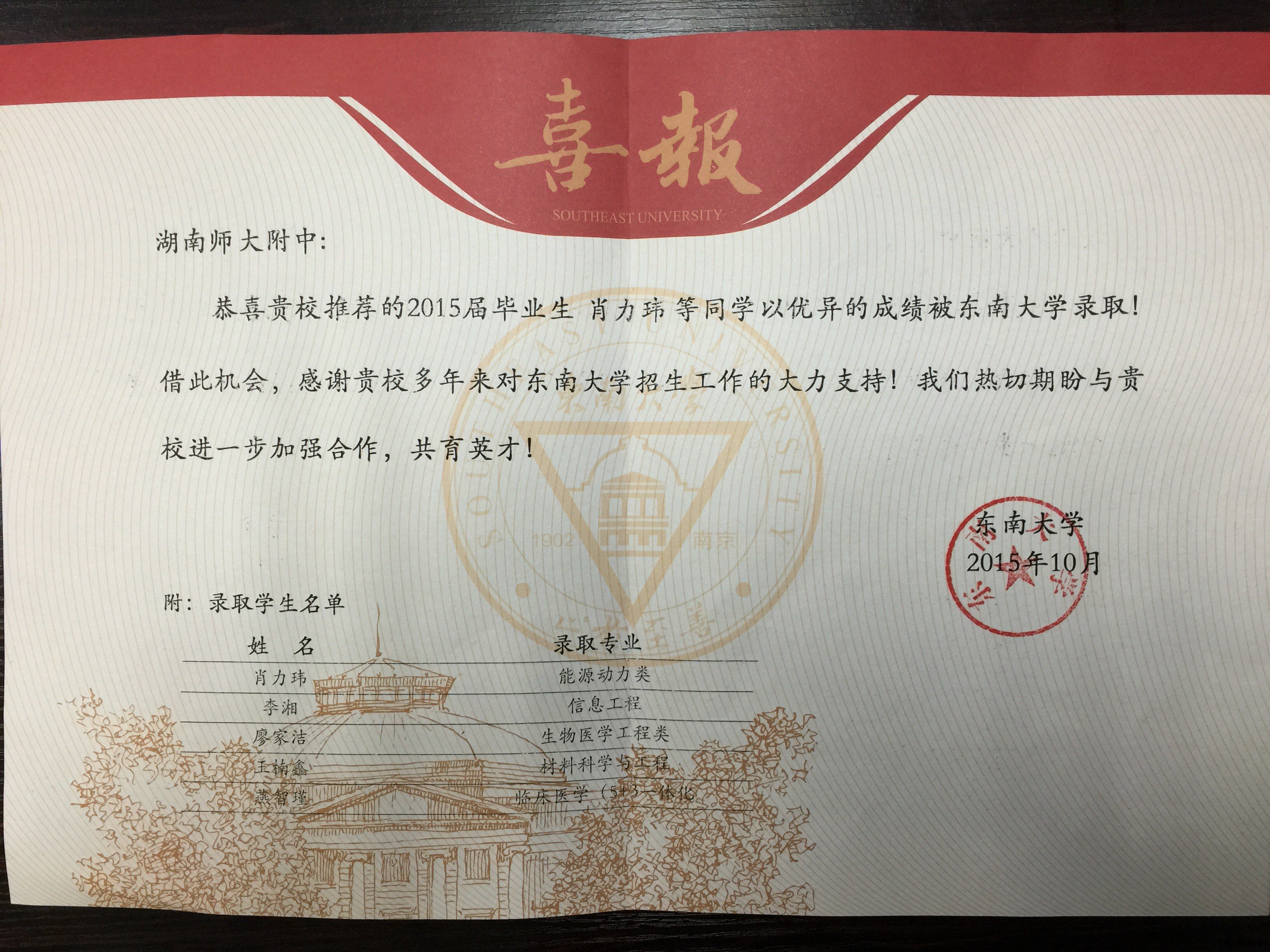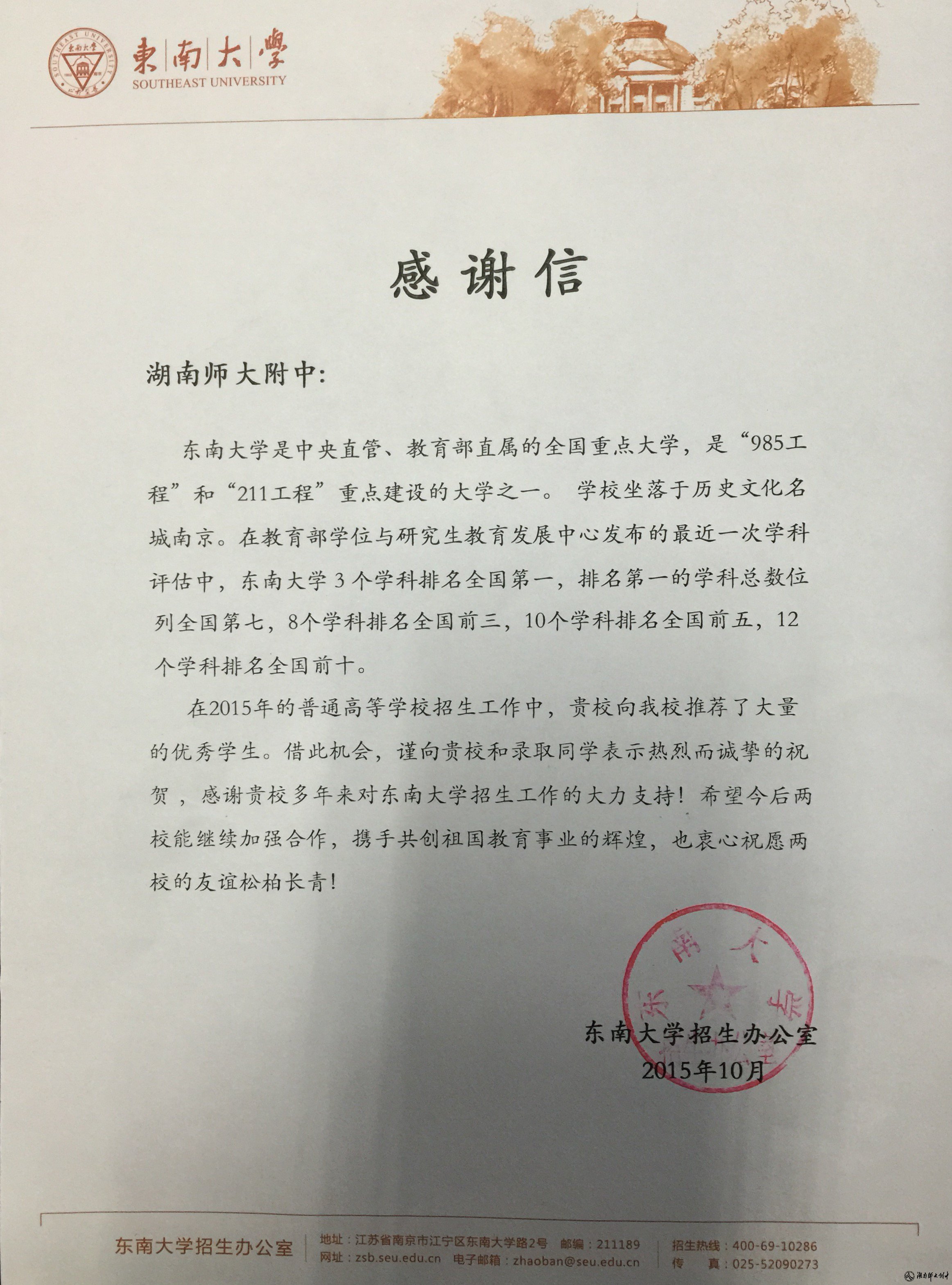 课程建设 教学资讯 课堂教学 学科竞赛 作业公示 校本课程 高考专栏 东南大学给我校发来喜报和感谢信 发布:教学与课程处 来源:未知 日期:2015-11-17 人气:分享到: 上一篇:2015年高考录取名单 下一篇:西北工业大学、北京邮电大学、兰州大学发来喜报 通知公告 更多 湖南师范大学附属中学2025年第二 湖南师范大学附属中学2025年教师 关于开展“科研优秀奖”评选活动 湖南师大附中2025-2026学年度第一学 湖南师范大学附属中学2025级新生 湖南师范大学附属中学大泽湖校区 最新动态 更多