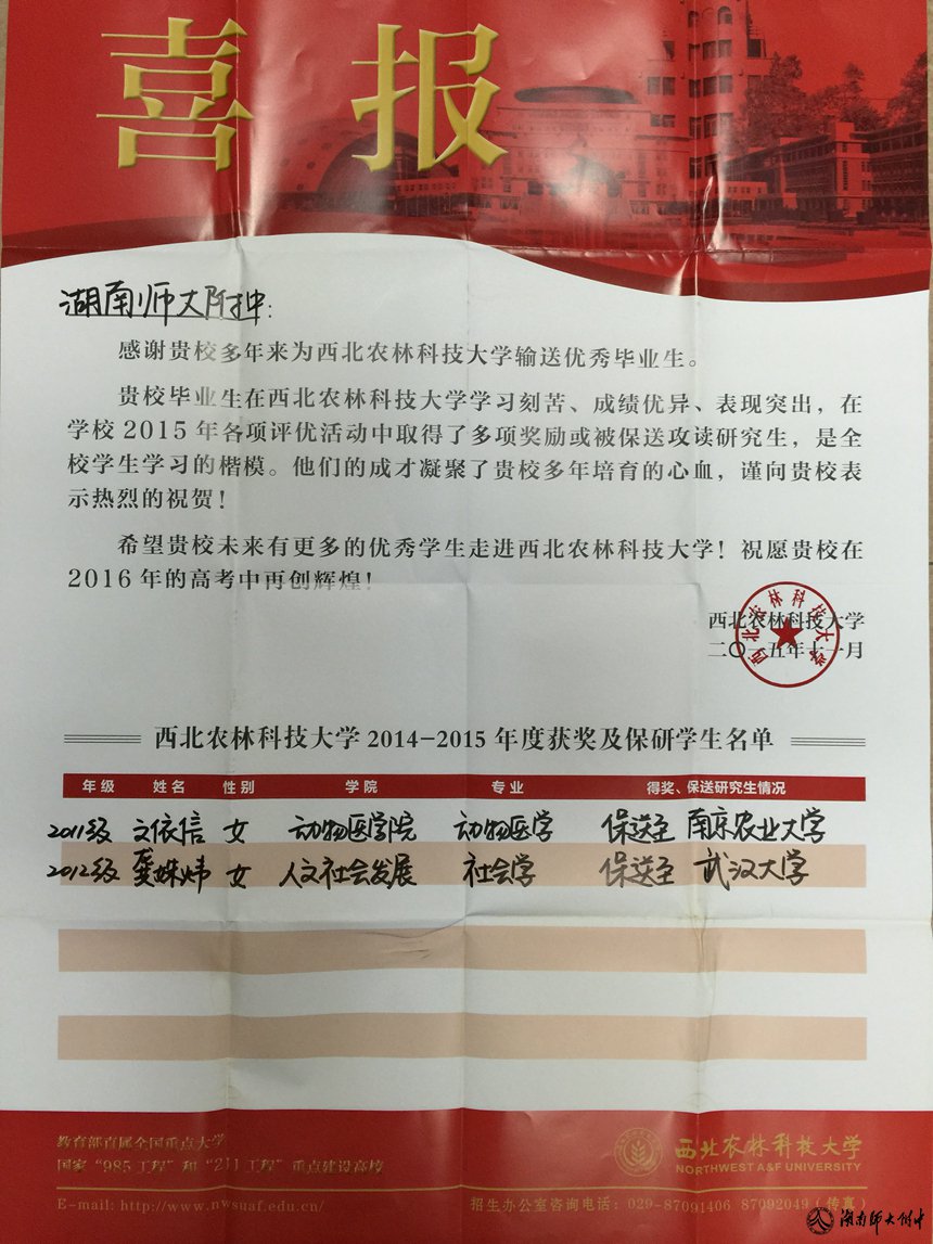 课程建设 教学资讯 课堂教学 学科竞赛 作业公示 校本课程 高考专栏 南开大学、西安交通大学等著名高校发来喜报或感谢信 发布:教学与课程处 来源:未知 日期:2015-12-01 人气:分享到: 近日,南开大学、西安交通大学、西北农林科技大学等著名高校给我校发来喜报或感谢信,原文如下: 上一篇:没有了 下一篇:北京师范大学发来喜报 通知公告 更多 湖南师范大学附属中学2025年第二 湖南师范大学附属中学2025年教师 关于开展“科研优秀奖”评选活动 湖南师大附中2025-2026学年度第一学 湖南师范大学附属中学2025级新生 湖南师范大学附属中学大泽湖校区 最新动态 更多