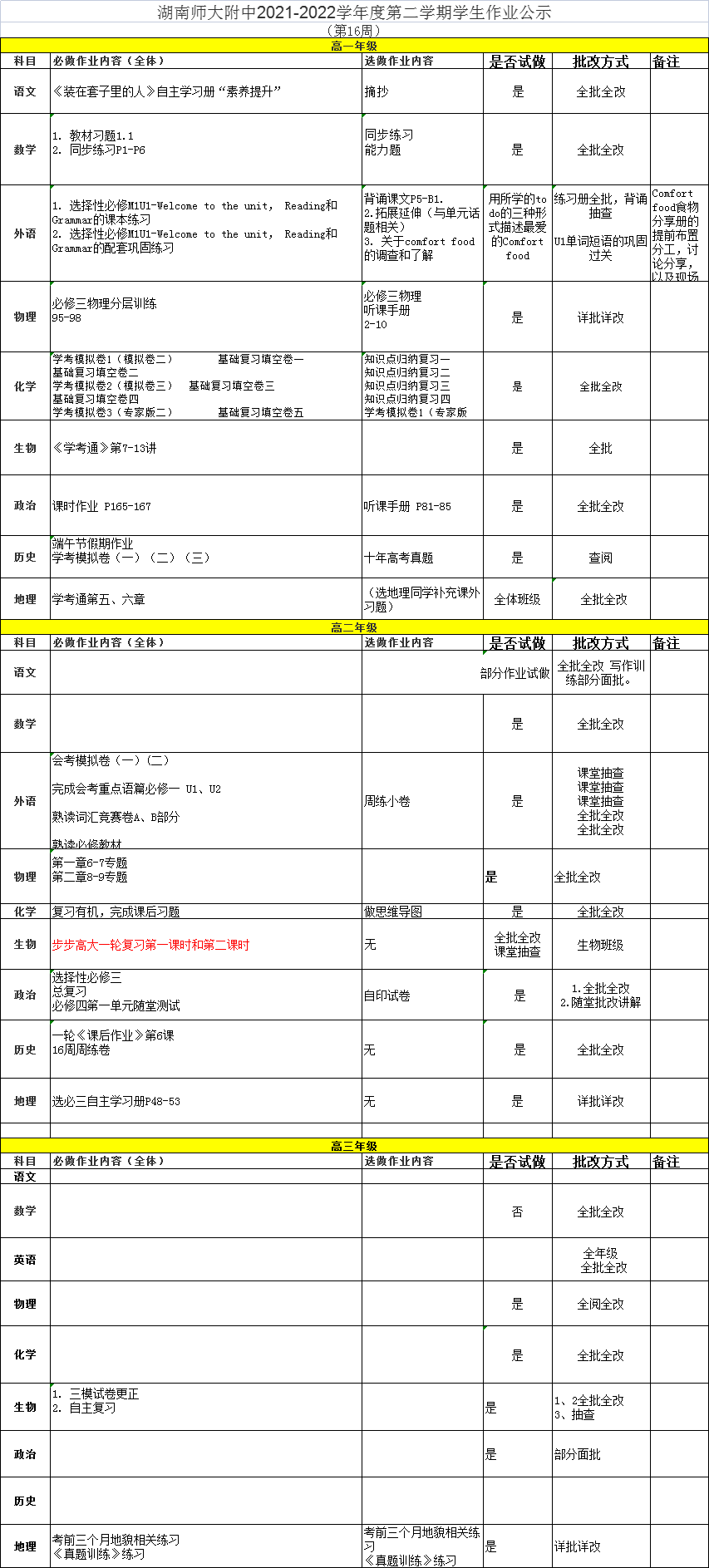 课程建设 教学资讯 课堂教学 学科竞赛 作业公示 校本课程 高考专栏 21-22-2作业公示16 发布:教学与课程处 来源:课程与教学处 日期:2022-05-31 人气:分享到: 上一篇:21-22-2作业公示15 下一篇:21-22-2作业公示17 通知公告 更多 湖南师范大学附属中学基建工程专 关于开展2024年事业单位工作人员 关于开展2023-2024学年度科研成果评 湖南师大附中2024年教育教学成果 湖南师范大学附属中学2024年秋季 湖南师范大学附属中学2024年暑假 最新动态 更多