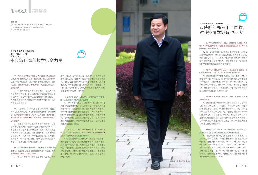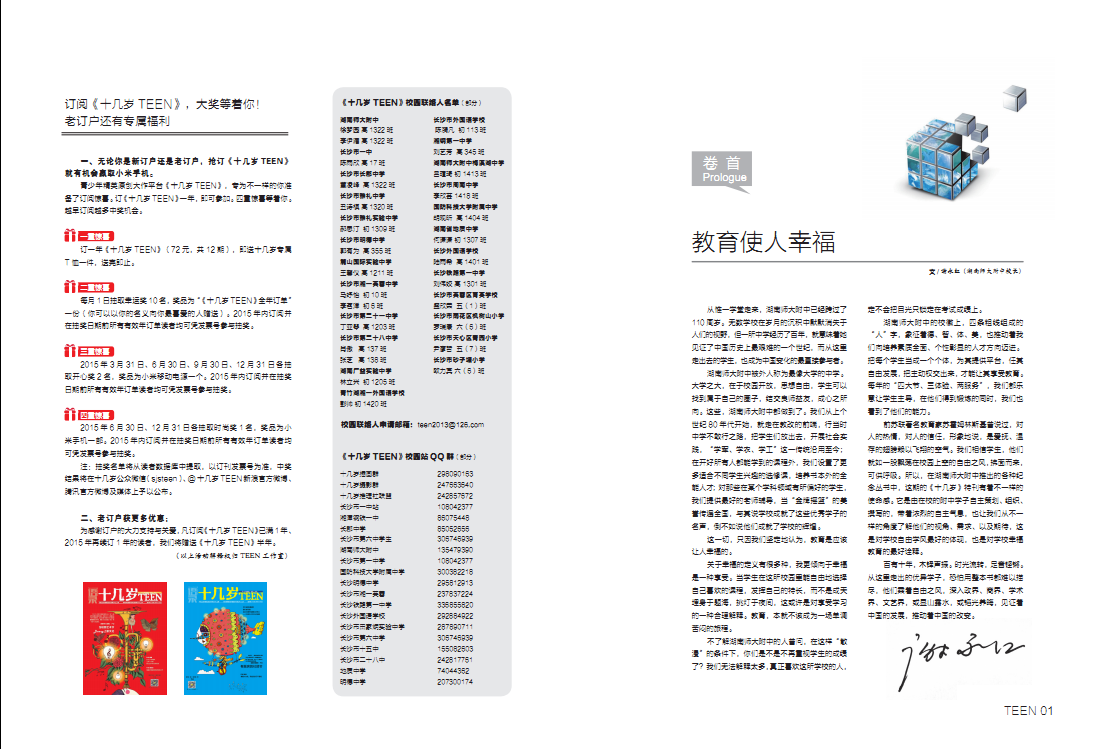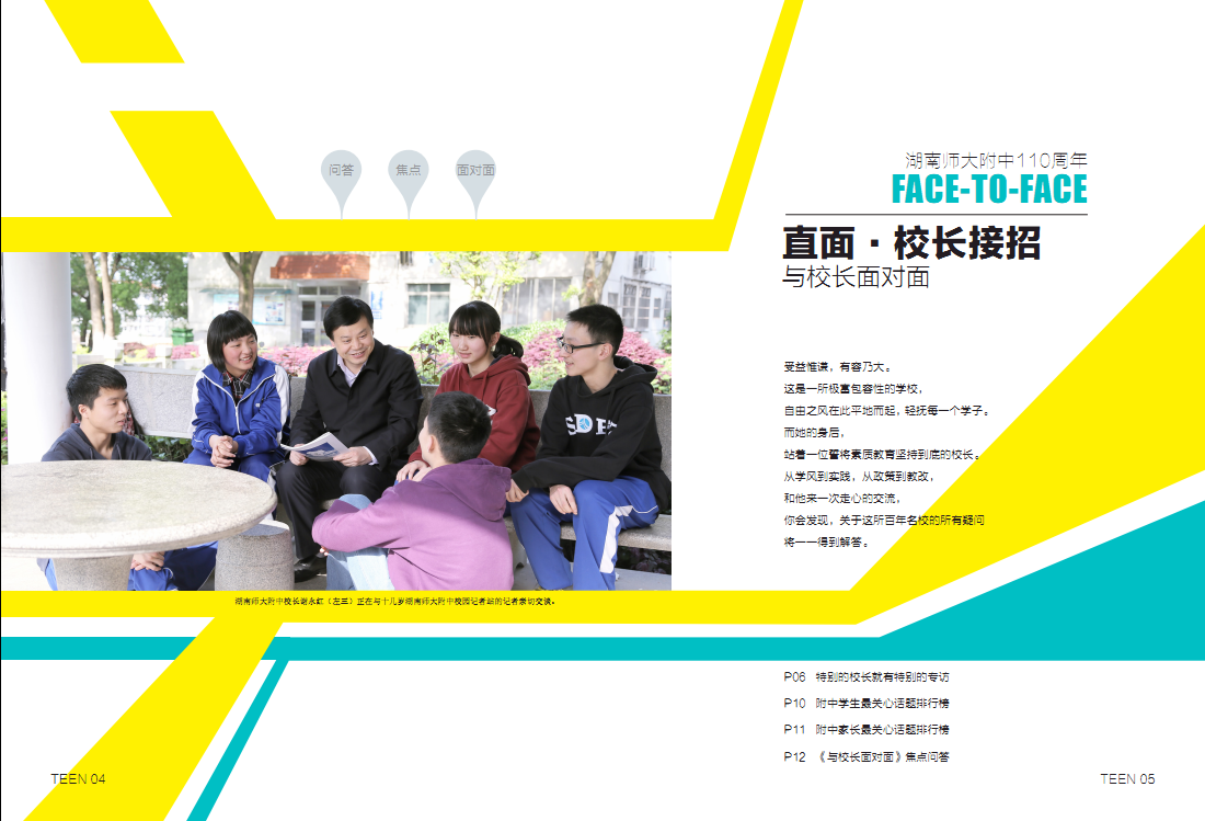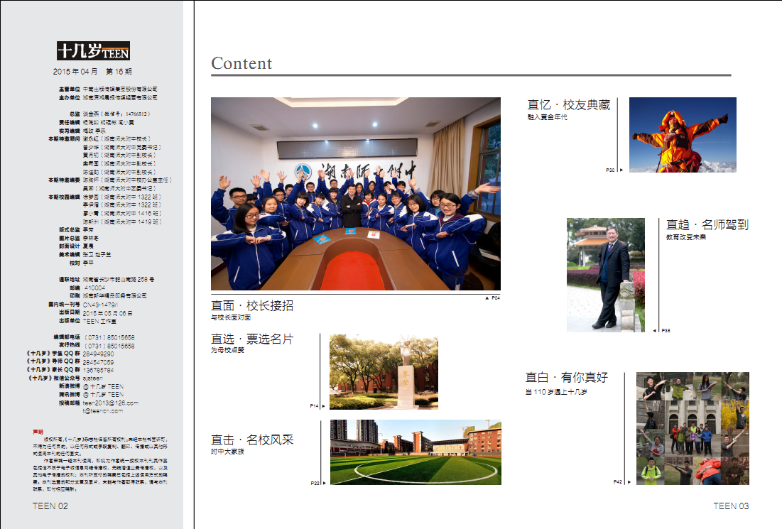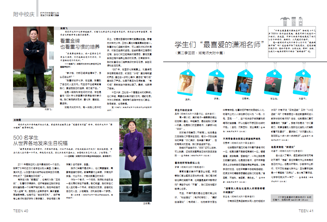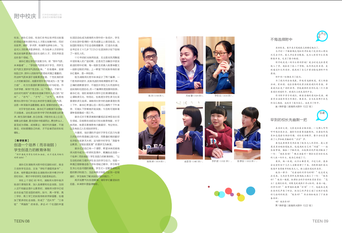 4月20日,全国唯一一家由青少年自主发声,融青少年采编实践为一体的先锋刊物《十几岁TEEN》杂志发行湖南师大附中110周年校庆特刊,全刊以“直面·校长接招”“直选·票选名片”“直击·名校风采”“直忆·校友典藏”“直趋·名师驾到”和“直白·有你真好”六大板块展示了我校的多样风采。