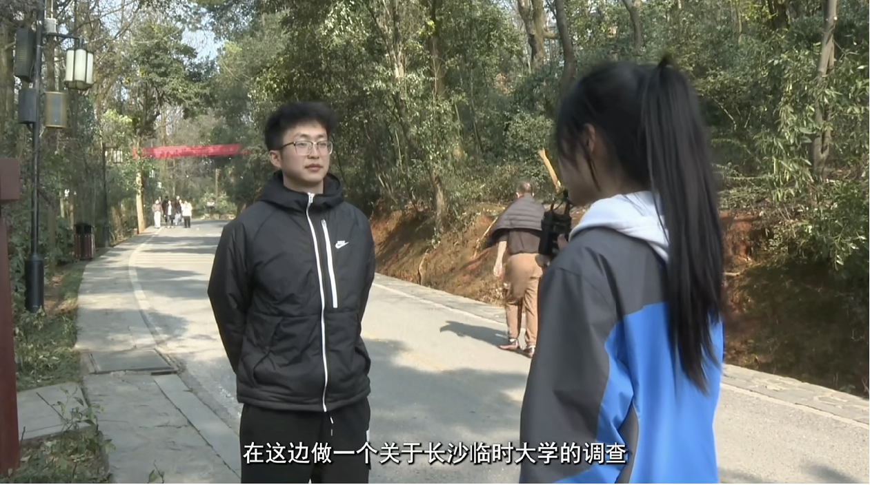 作品以沉浸式探访开篇,镜头跟随女主漫步岳麓山,偶遇 “清华界碑”的悬念迅速抓住观众。在两位指导老师的专业把控下,作品通过街头采访、图书馆查档、专家访谈等多元形式,层层揭开历史真相:1935 年清华大学预判时局筹备南迁,校长梅贻琦委托丁文江选址长沙,1936 年立界碑并修建校舍,梁思成、林徽因设计的民主楼与和平楼至今留存于中南大学。