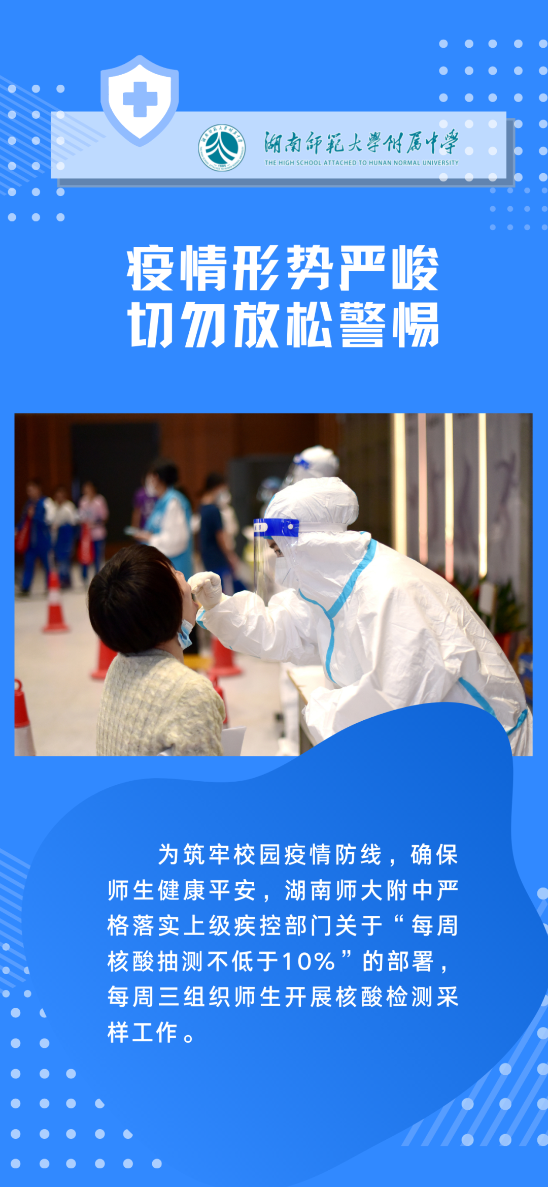 疫情防控关乎您和家人及全社会的健康安全,守护好每一位师生的生命安全和身体健康是我们共同的使命和心愿。面对新的疫情防控需要,请大家配合防疫要求,共同做好疫情防控应急状态下的各项工作,为自己及家人的健康安全保驾护航!