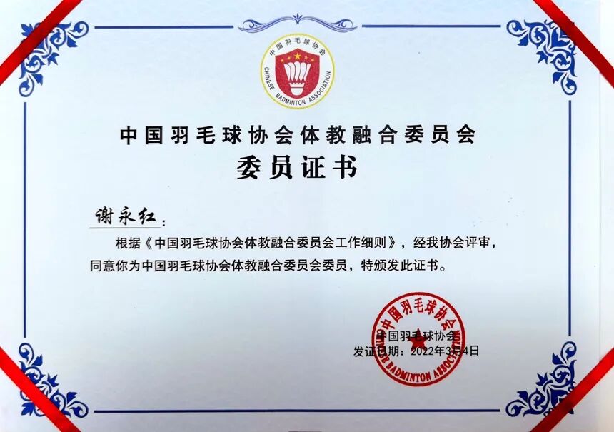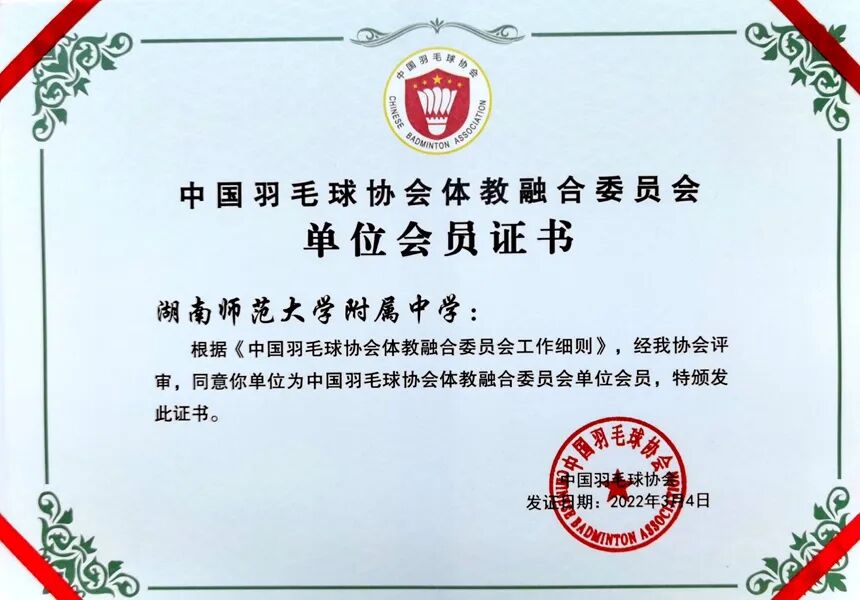 今年,湖南师范大学附属中学当选为中国羽毛球协会体教融合委员会单位会员,同时,校长谢永红当选为中国羽毛球协会体教融合委员会委员。