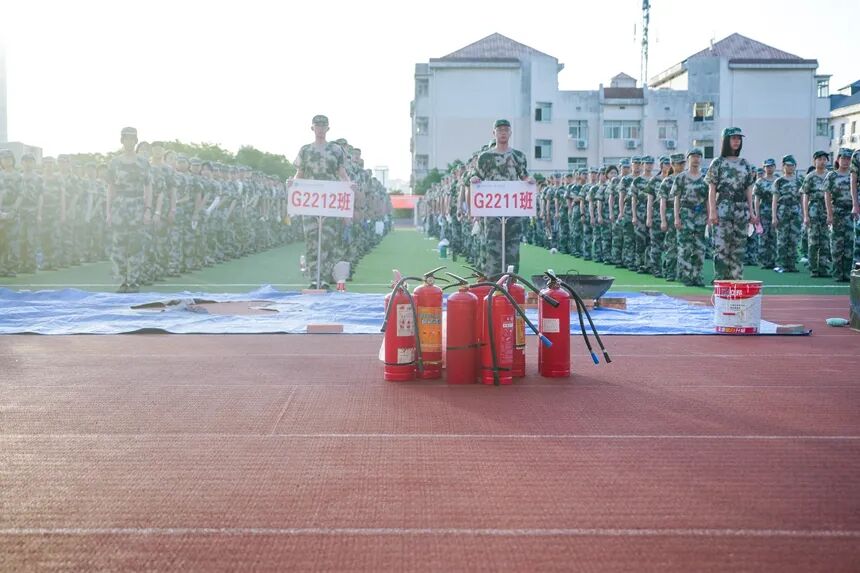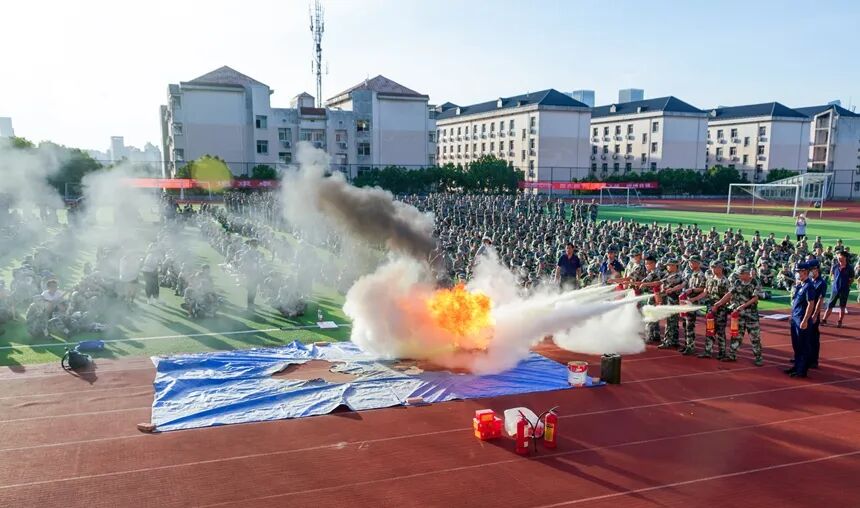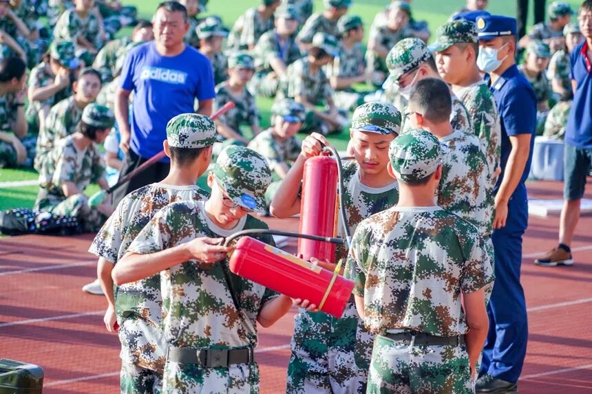 军训期间,学校组织开展安全应急疏散和灭火实战演练,演练活动共分为应急疏散演练和灭火实战演练。第一阶段在学生宿舍模拟了火情发生现场,各生活老师马上组织学生,进入紧急疏散状态∶学生用湿毛巾或衣服等捂住口鼻迅速而有序地从宿舍撤离到田径场,没有出现拥挤、踩踏等安全事故。从前期培训、火情报警、应急反应、出口指示、把控指挥、严密组织、有机配合、快速疏散、安全集合、清点人数等各个环节,实际演练了火场逃生避险具体过程。第二阶段师生一起学习了消防基本知识,了解了常用的手提式干粉灭火器的使用方法,亲身体验灭火器现场灭火的实际操作,在真实的模拟现场演绎了一堂生动的消防教育体验课,提升了消防安全意识和逃生自救能力。