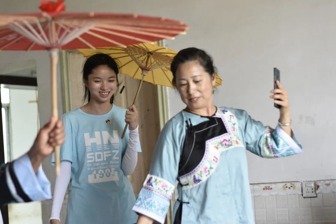 在十八洞村学击苗鼓,体验苗绣,走近苗医;在新化正龙古村了解傩文化,制作傩面具;在桑植赶早集;在安化品擂茶。同学们沉浸其中,品味民俗风情之乐。