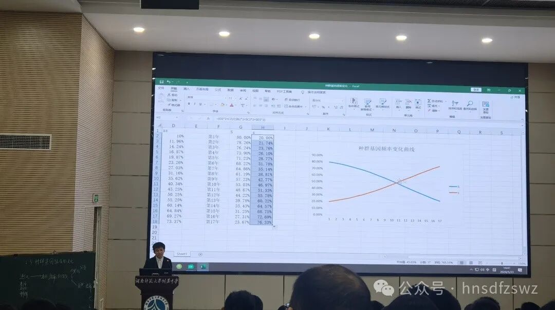 彭宇老师执教的内容是《种群基因组成的变化》。彭老师本节课以桦尺蛾种群命运变化导入,带领同学们深刻理解进化的本质。通过对桦尺蛾种群基因型频率和基因频率的分析,构建相关模型并予以应用。同时,利用信息技术,分析桦尺蛾种群变化相关数据,直观得到种群基因频率的变化曲线,加深学生理解。