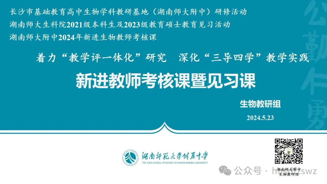 2024年5月23日,长沙市基础教育高中生物学科教研基地(湖南师大附中)研修活动暨湖南师大生科院2021级本科生及2023级教育硕士教育见习活动、湖南师大附中2024年新进生物教师考核课在湖南师大附中会议厅顺利举行。