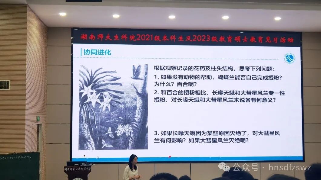此次展示的两堂见习课为湖南师大附中2023-2024学年度新进教师考核课,湖南师大附中副校长苏建祥,课程与教学处副主任王建,信息技术中心主任周大勇,学术委员会委员李尚斌,纪检监察室副主任向阳,教研组组长杨群英、副组长周娈到场指导,生物教研组大部分老师、师大生科院2021级本科生及2023级教育硕士到现场观摩听课。