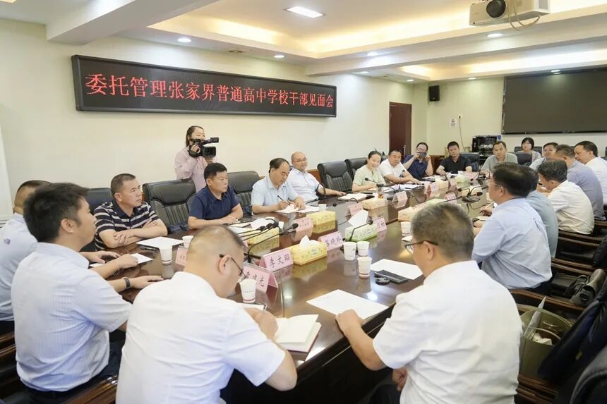8月7日上午,委托管理张家界普通高中学校干部见面会在张家界市政府举行。会议由张家界市委教育工委书记、市教育局局长郑朝霞主持。