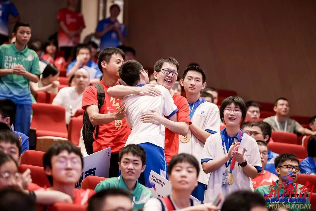 公布获奖成绩时,获奖选手与竞赛教练开心相拥。