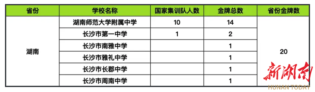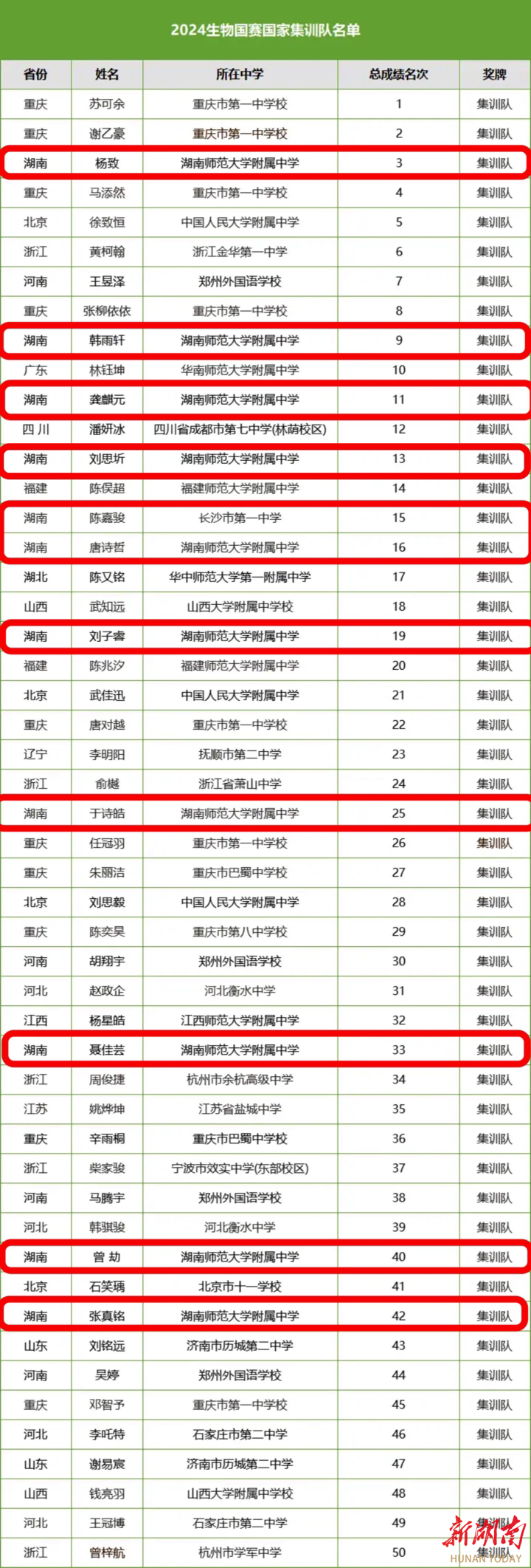 8月20日,2024年第33届全国中学生生物学奥林匹克竞赛决赛获奖名单公布。湖南省代表队成绩优异,共获得20枚金牌,并有11人入选国家集训队,入选总人数位居全国各省之首。其中,湖南师范大学附属中学的表现一骑绝尘,共斩获了14枚金牌、1枚银牌,10名金牌得主被选入国家集训队并获得清华大学、北京大学的保送资格。该校金牌总数、国家集训队入选人数都位居全国中学第一。