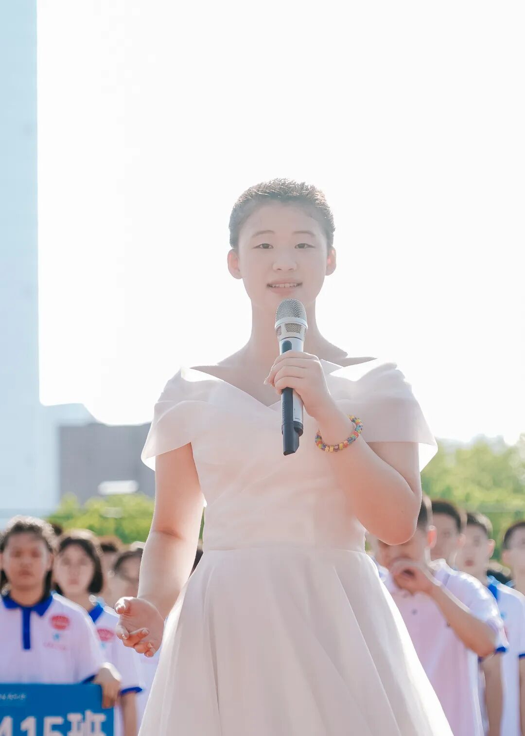 学员代表尹麓茗同学发言。她认为军训作为高中第一课,不仅是体质的锻炼,更是意志的磨砺。最后他代表全体学员向领导、教官和老师郑重承诺:严守纪律、吃苦耐劳、团结友爱、善于学习,誓以饱满的热情和高昂的斗志完成军训任务。
