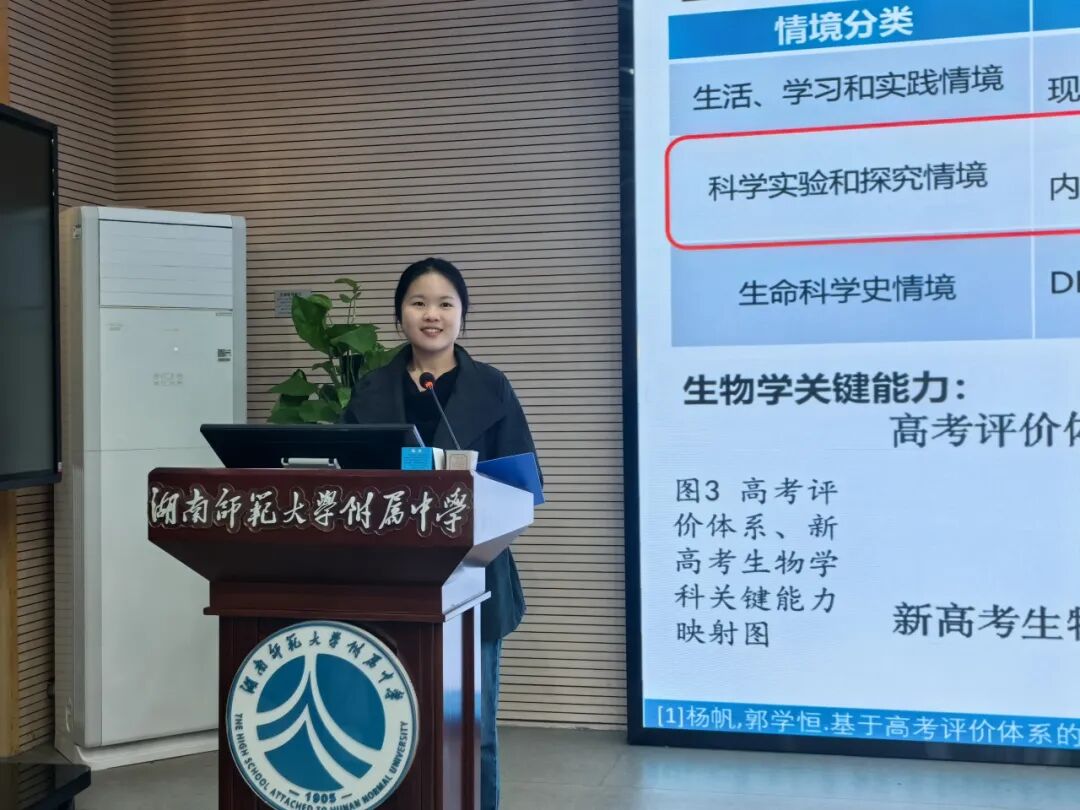 本次说题比赛由生物教研组副组长周娈老师主持。生物教研组组长杨群英老师、学术委员会委员李尚斌老师、教研组副组长周娈老师和贺俊老师,高一年级生物备课组长陈佳健老师、金牌教练冯建国老师、高三年级生物备课组长吴晓红老师共七位老师担任评委,教研组其他教师及来自湖南师范大学的实习生物教师全程观摩学习。