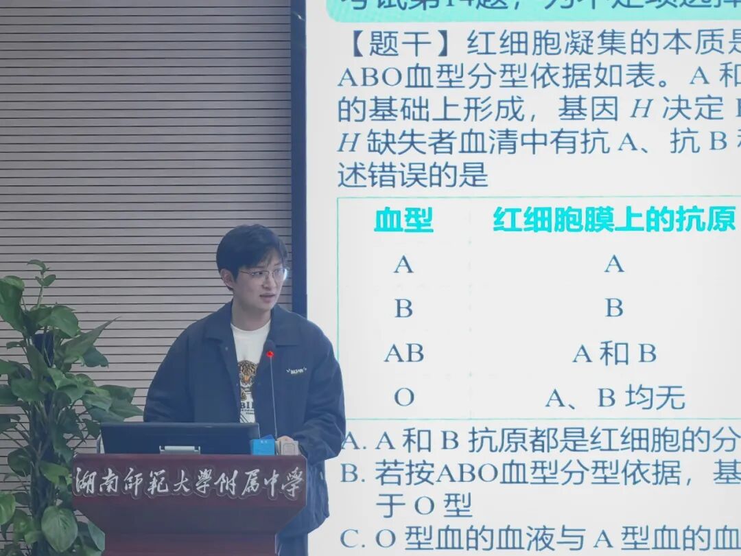 周鸿林老师以《信息提取明思路,图文转化促分析》为主题,对2025年生物学湖南卷第14题展开说题分析。从关键情境信息、生物必备知识、课标概念体系、核心素养要求等方面分析概念情境,站在课程标准的上位视角对高考试题的考点和情境进行检视。在对试题情境的溯源的过程中,将医学《生理学》教材中与ABO血型分型的相关过程性原理转化为概念图解,以直观清晰、条理性强的可视化表征呈现出与ABO血型系统表达和形成过程中有关的分子生理与遗传基础。试题的解答从题干的文本和表格信息出发,同样以构建概念图解的方式,用概念节点与连线箭头等图像元素将复杂的遗传、生理过程逐个简化,降低题干信息的外部认知负荷,提高对题干信息的理解效率。在绘制出概念关系图解的基础上,利用简化的表征形式对试题选项进行分析。周鸿林老师在说题过程中重视对图-文表征的相互转化,借助视觉表征工具在复杂的科学概念和生物学流程呈现方面的优势,合理组织新信息,以突破长文本和复杂情境试题的理解难关,对于可视化概念教学有一定的实践指导意义。