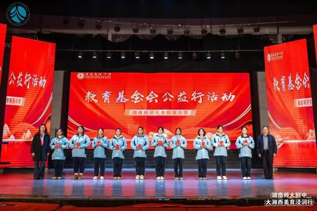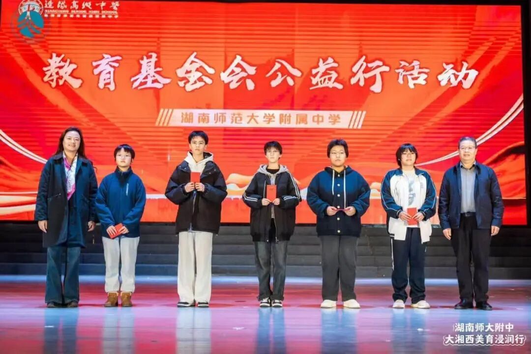在两所学校的联欢晚会中都有一个温暖的环节——湖南师大附中校友会与教育基金会为当地品学兼优的学生颁发助学金。
