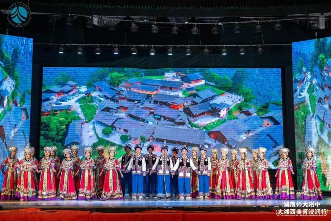 背着乐器和演出道具,11月21至23日,湖南师范大学附属中学(简称“湖南师大附中”)20余名艺术特长生,在学校老师的带领下,跨越三百公里,走进大湘西,与结对托管的张家界市民族中学(简称“民中”)、边城高级中学(简称“边高”),开展“大湘西美育浸润行”活动。三天时间里,文艺汇演、美育课堂、专家讲座、公益捐赠等一系列活动密集展开,不仅是美育资源的输送,更是一次教育理念的深度交融。