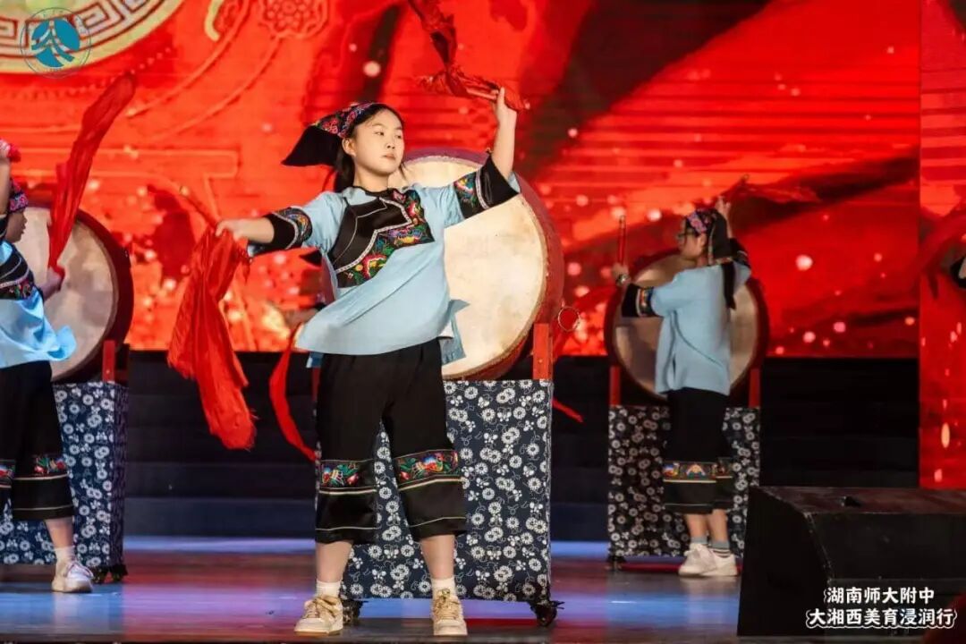 欢快的苗鼓声响起,“大湘西美育浸润行”文艺联欢在两所学校精彩上演。舞台上,身着民族服饰的湘西学生们挥舞鼓槌,铿锵的鼓点震撼全场。
