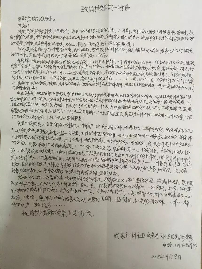 2015年9月,一封来自咸嘉新村社区居民的感谢信“温暖”整个附中校园。“尊敬的谢永红校长:您好!我们虽然没有见过面,但我们一家却沐浴过您的关怀。我只是咸嘉居民中的一个普通代表,自从十年前,您带领下的师大附中志愿服务队与咸嘉开展爱心结对帮扶活动以来,您给予我们咸嘉人太多最温暖的爱心关怀。”