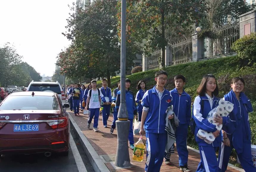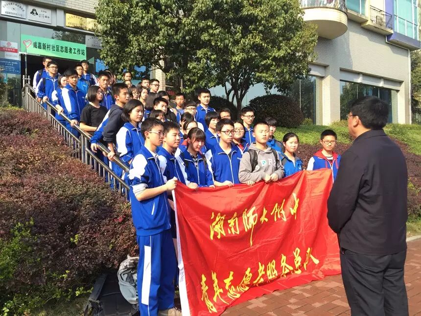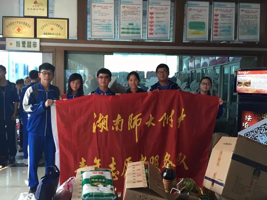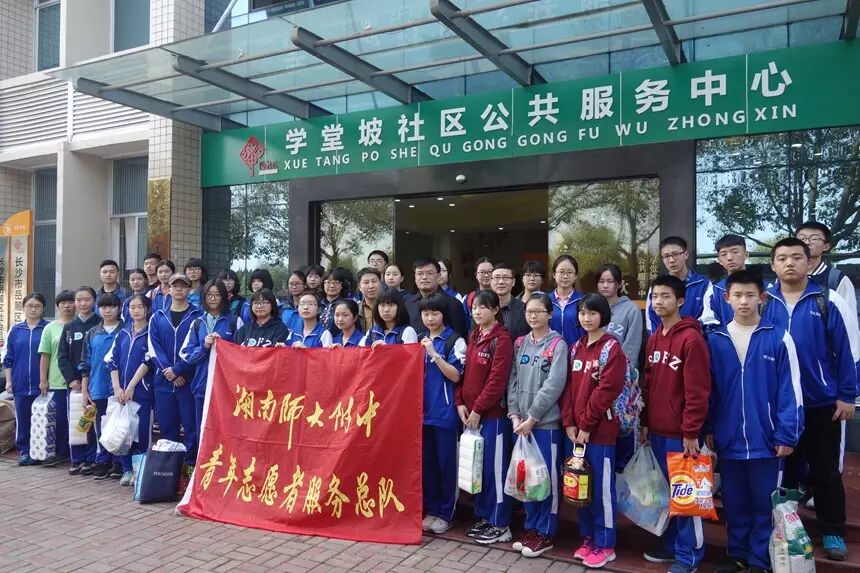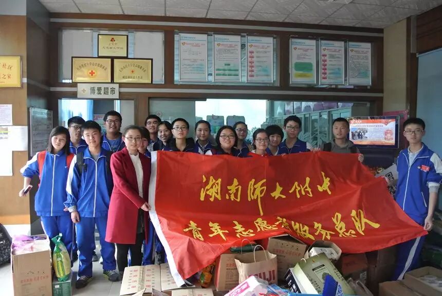 附中的青年志愿者们每年都会赴咸嘉新村开展志愿服务活动,至今已有十年。2014年国际志愿者日前夕,志愿者队师生共计40余人,走入咸嘉新村社区,向社区的雷锋超市“湖南师大附中爱心捐赠专柜”捐赠一万多元爱心物资;向社区的贫困家庭送去一万元困难户家庭慰问金。